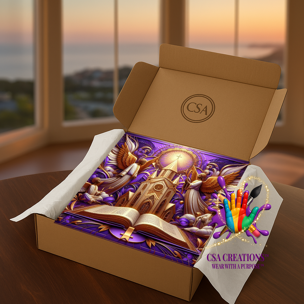 Bring inspiration into every space with the Heavenly Wisdom 11×18 Towel. This radiant design captures a golden cathedral illuminated by heavenly light, surrounded by angelic guardians, and framed by the open Book of Life — a powerful reminder of faith, wisdom, and strength. Crafted in rich purples and shimmering gold, this towel transforms a simple essential into a keepsake of beauty and devotion.